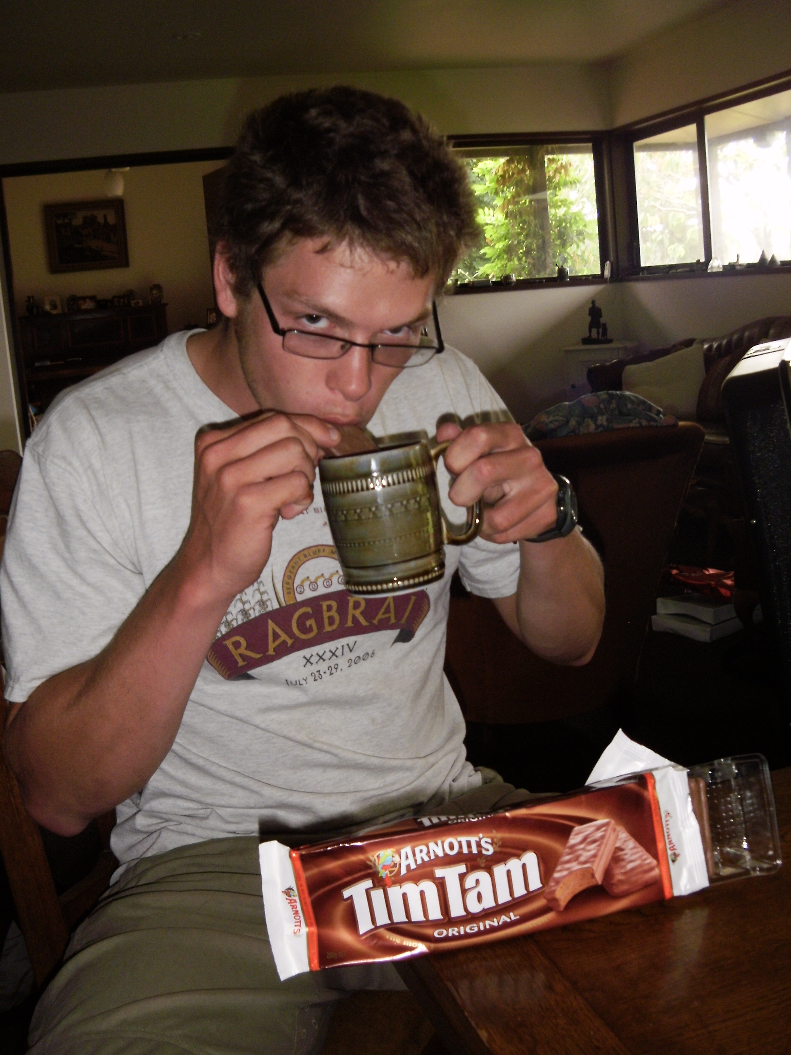 Sam and Laura picked me up late at the Wellington airport and we made the 2 hour drive to their host’s home in Palmerston North. We had a Christmas in February gift exchange, called it a night, and spent the next day assembling the bike, going to the grocery and finding an adaptor for all my necessary electronics: Laptop, Kindle, iPhone, iPod, and camera. That evening Sam was kind enough to introduce me to a New Zealand delicacy: the Tim Tam Slam. Tim Tams are little chocolate covered graham cracker and chocolate filling cookies. Sam explained to me that you bite off a corner, bite off the opposing corner, plunge one end of said Tam into milk or hot chocolate, suck liquid up through cookie, and end up with a mushy, melting mass of Kiwi goodness. I could not believe it myself when I actually ate one of these carbohydrate yummies.