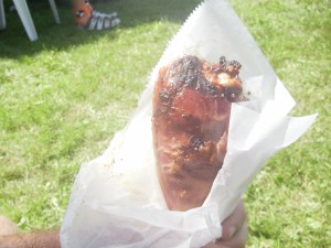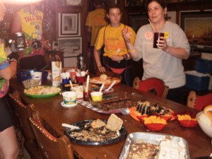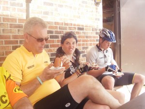 The next picture is another story. Riding into a town down Main Street, we heard the “Free Beer” call, and never being a team to pass that up, we stopped and indulged. When we started asking for who to thank, and why, we were directed into the house where the table was full of food of all kinds, just because. The lady of the house refused any donation (“Oh, Goodness NO!”), and said she was just so excited about Ragbrai coming through her town she had been cooking for days.
