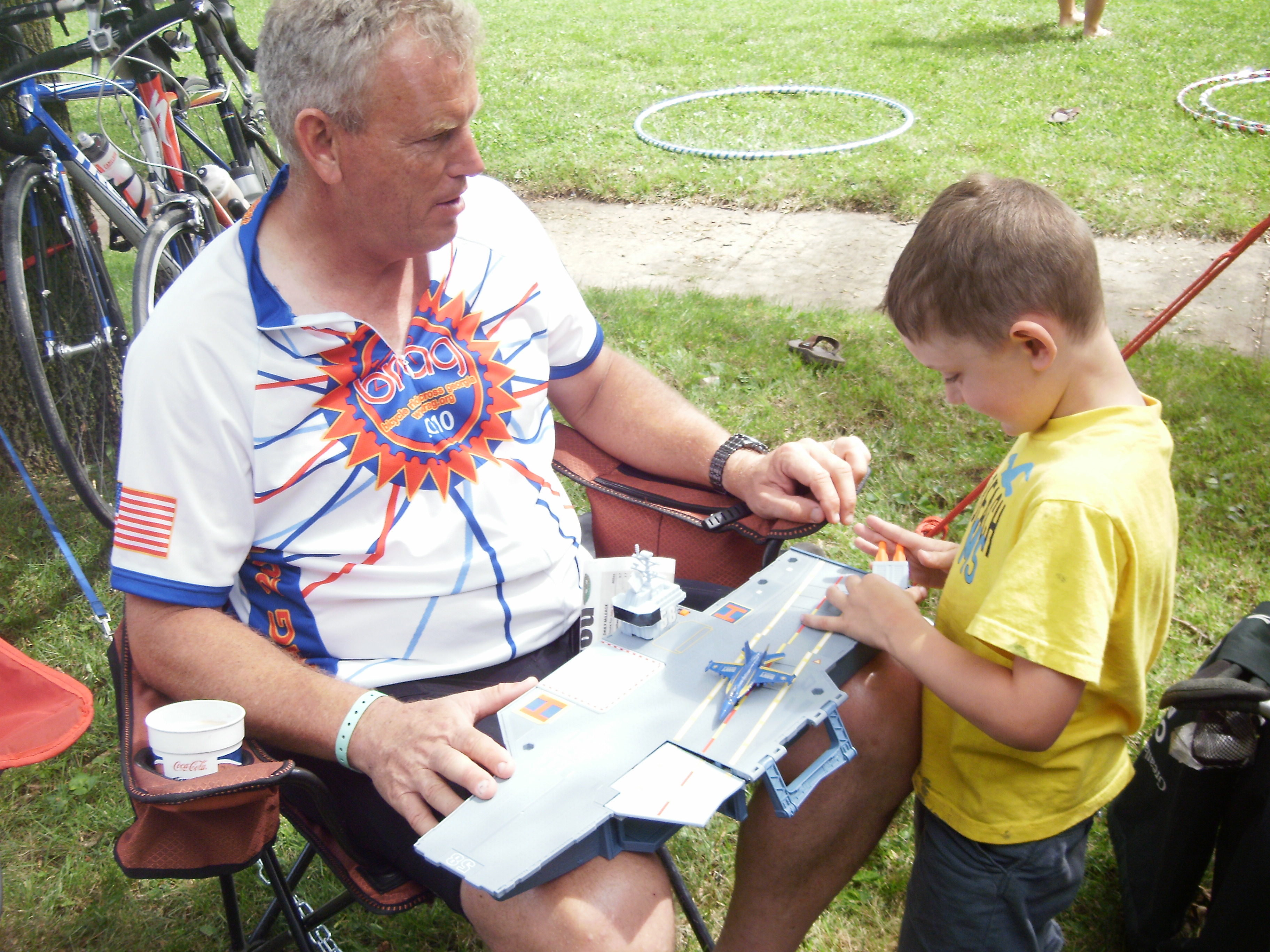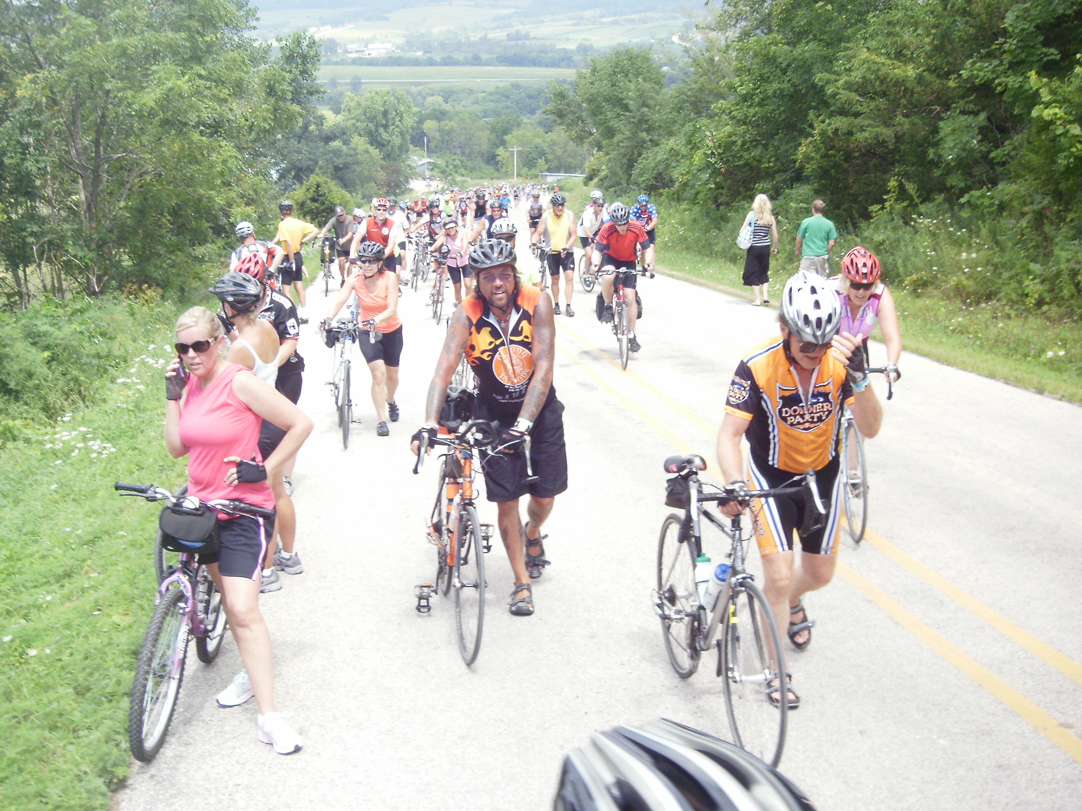 This Ragbrai had been billed as one of the fastest, shortest, and flattest. However, on the last day, the day into Dubuque, we had a little different picture. We had been hearing about Potter’s Hill all day long; we knew it was steep, and we knew it was about a mile. We did not know it was an 11% grade. I have never walked my bike up a hill. Until Saturday. But here’s the best part: Flava Flave pulled Aden up the hill in the kiddie cart. He’s a beast, and he impressed all of us. I think Aden may have been playing his DS at the time.