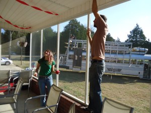 Saturday dawned party day – in went the BBQ roasts and on went the coffee. My parents and brother headed up from Georgia, and my aunties headed down from Gallatin as the kids took the decorating into their own hands. Soon we had the bus and jeep in the back yard, streamers on the porch, balloons, slack line drawn from the bus to the jeep, bonfire assembled, kegs icing, and signs put up out at the road.