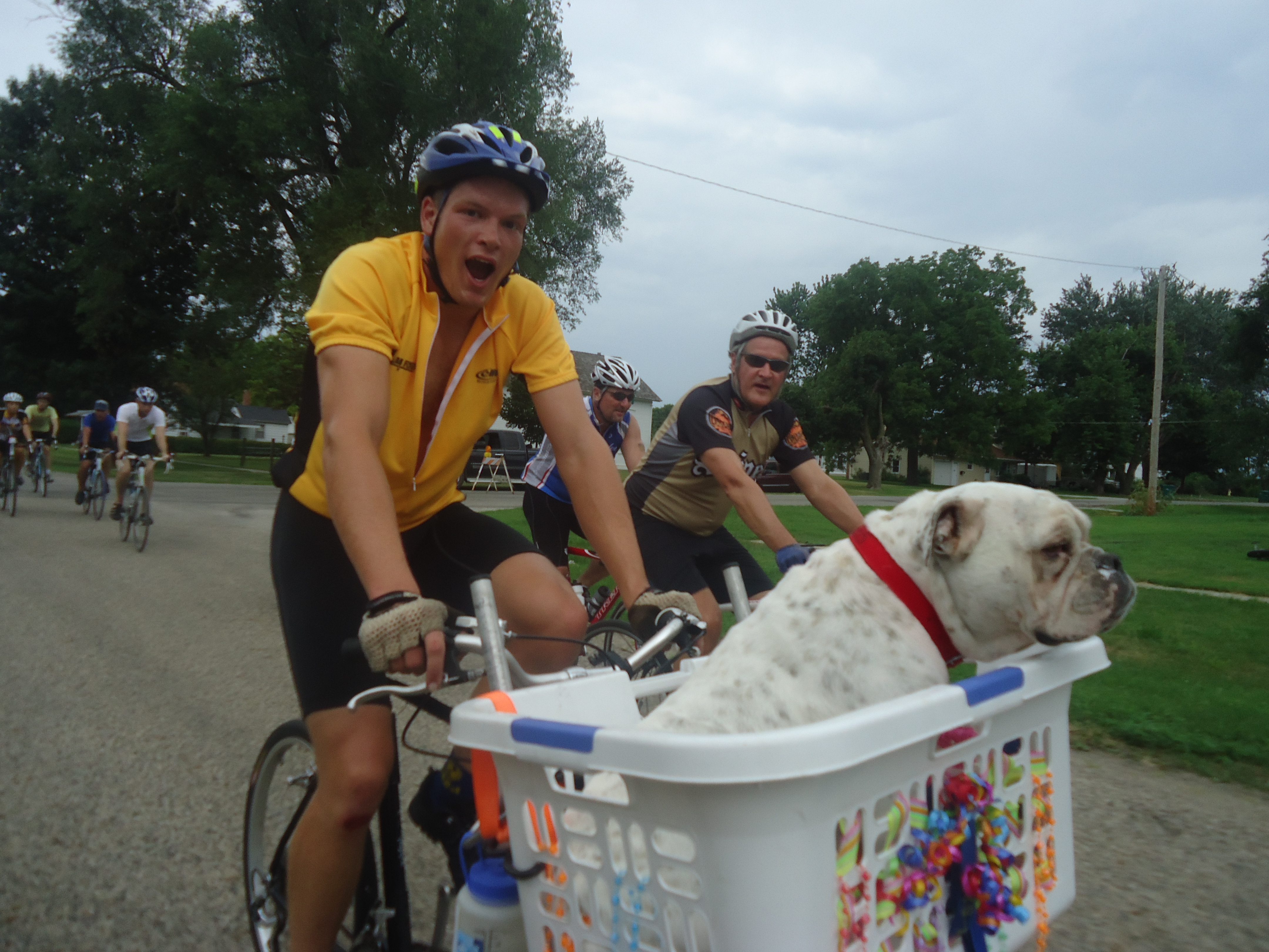 Uga, for her short life, went on many adventures with us. She traveled to Florida in 2009 for a race I had in Panama City. She made several trips to Atlanta when we visited family; she even went on a ski trip to Colorado. But her biggest adventure every year was on the family trip to Ragbrai, the bike ride we take each year to Iowa. We take a team of 16-20 people on a converted school bus, and she and Boo have served as team mascots the past several years. This past year, just 2 weeks ago, son Sam configured a way for Uggs to get to be out on the ride itself, instead of just confined to bus patrol. In her 2 days of riding, 6-8 hours each, she never once laid down in that basket. Too much to see, too many people to smell, too many pictures to pose for.