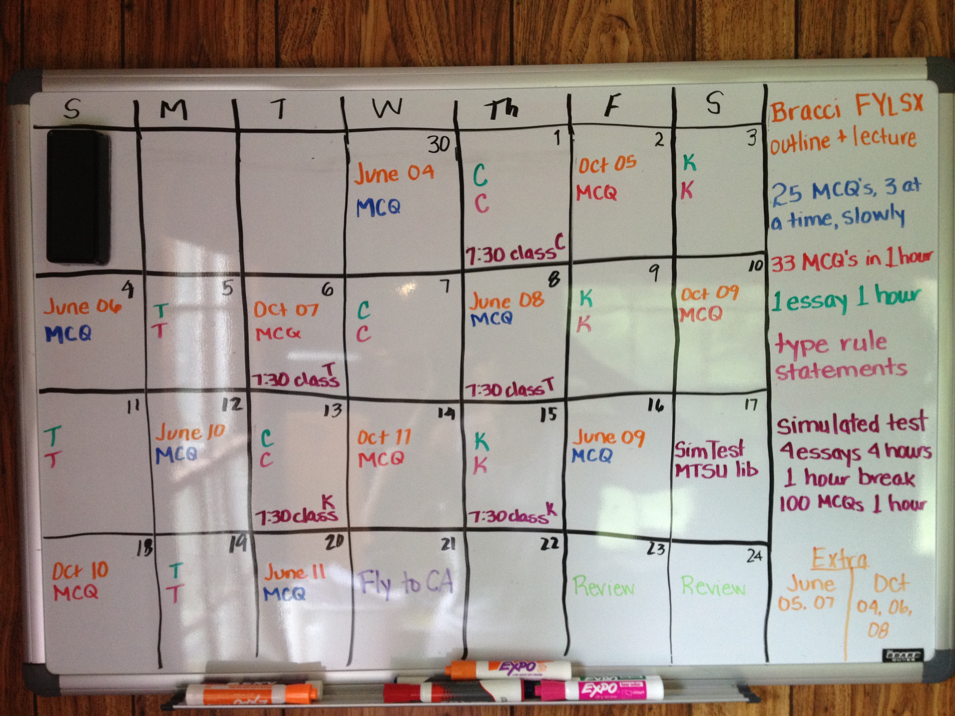 On the mechanical side, I also wrote out my rule statements, one subject at a sitting, about 2x a week in the month leading up to the test. That was clearly a skill for the essay writing; those rule statements practically typed themselves by the time of the test. I’m kind of a data junkie, so after writing them each time (using 90+ minutes in the beginning, <45 after a few times), I graded them (with red font – once a teacher, always a teacher) and wrote the number of major errors and minor errors on my dry-erase progress chart. (Are you gaining a deeper understanding of why I live alone?)