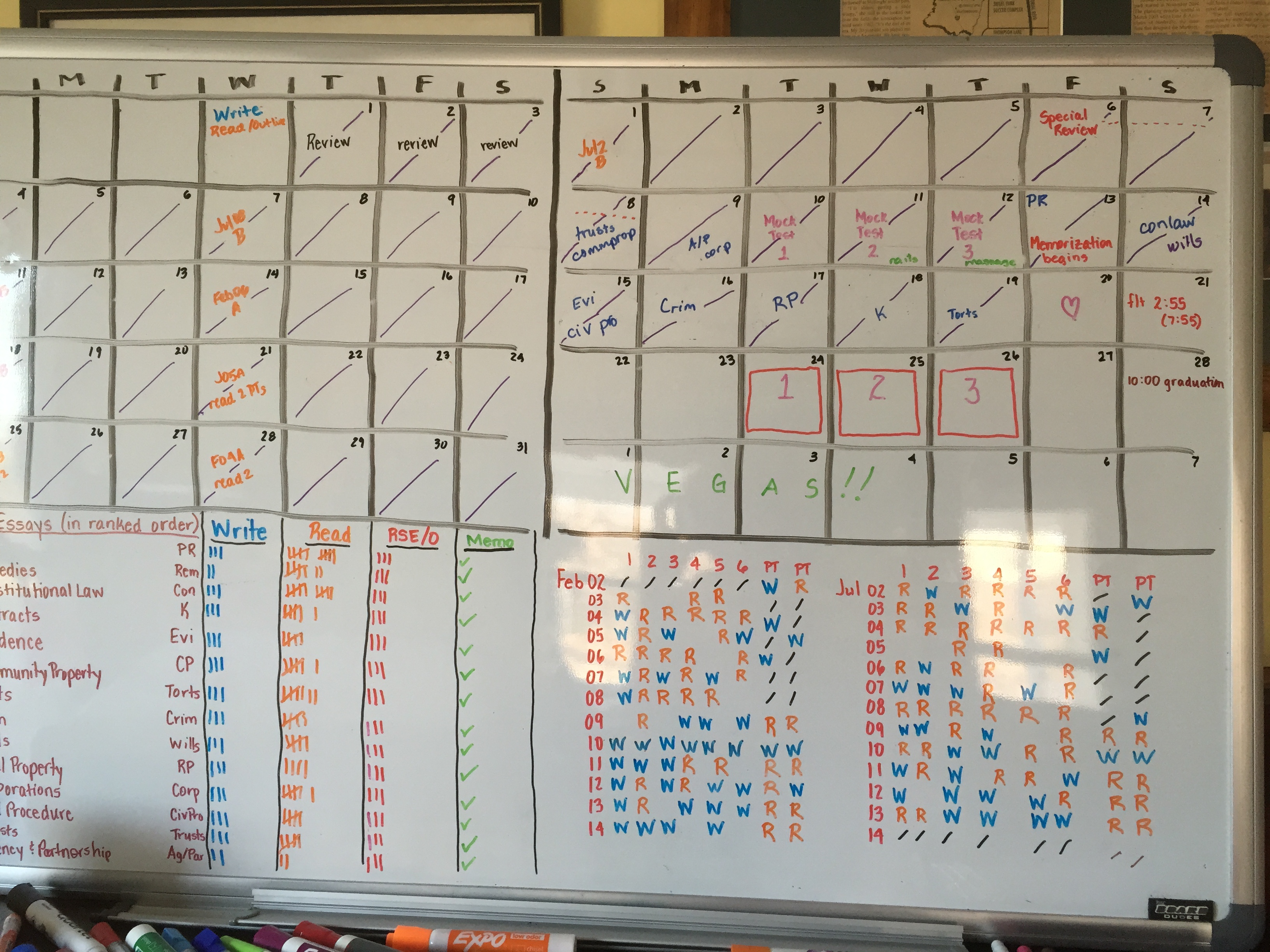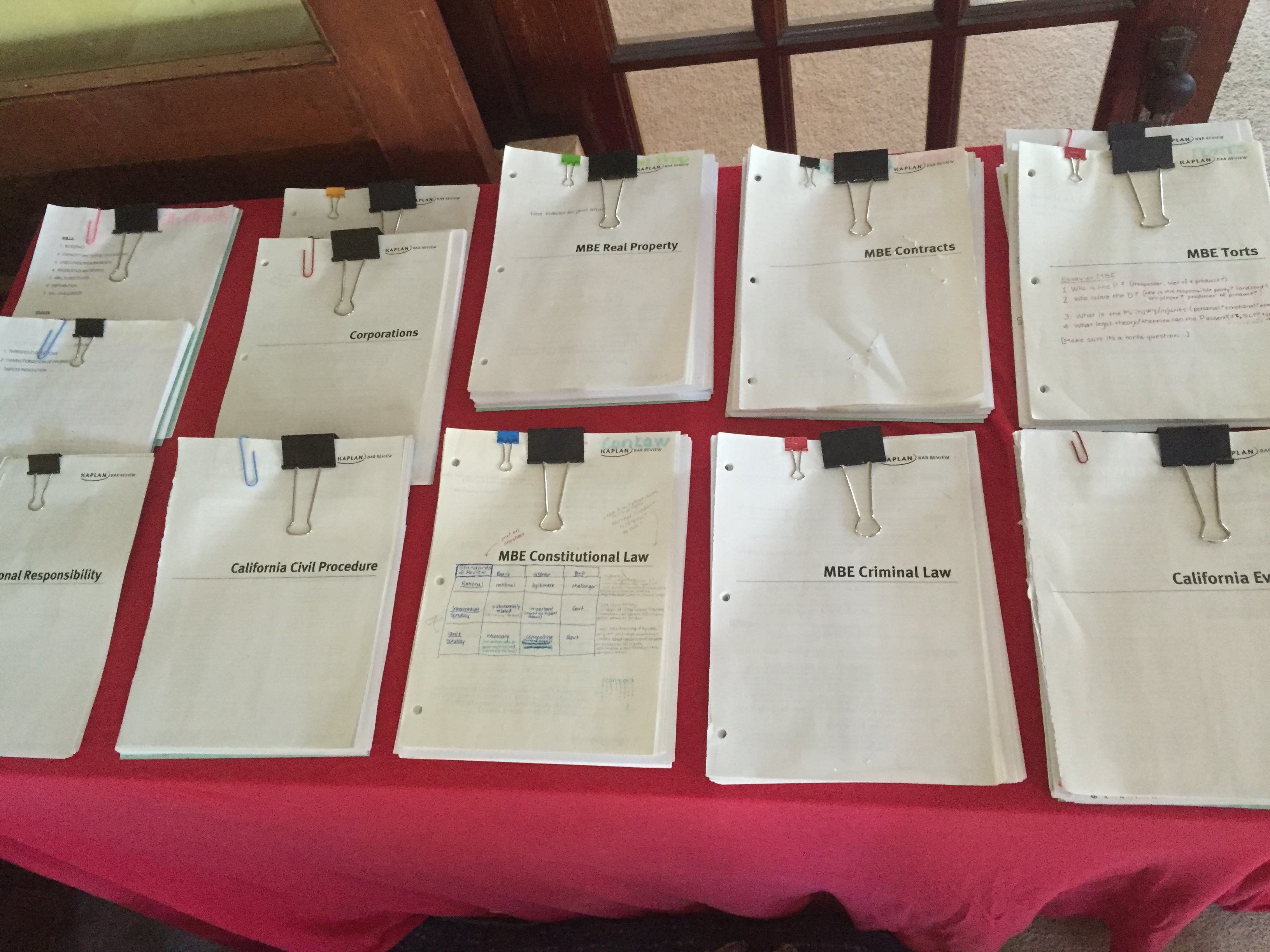 This post is the third in the series linking to the actual Bar Exam experience and law school graduation. I’m going to hold off on commentary until results are released in May, 2015, so it will be void of helpful hints and suggestions. I kept a journal during Review that I plan to post later; until then this is simply a summary and description of what I did in the months and weeks leading up to the California Bar Exam.