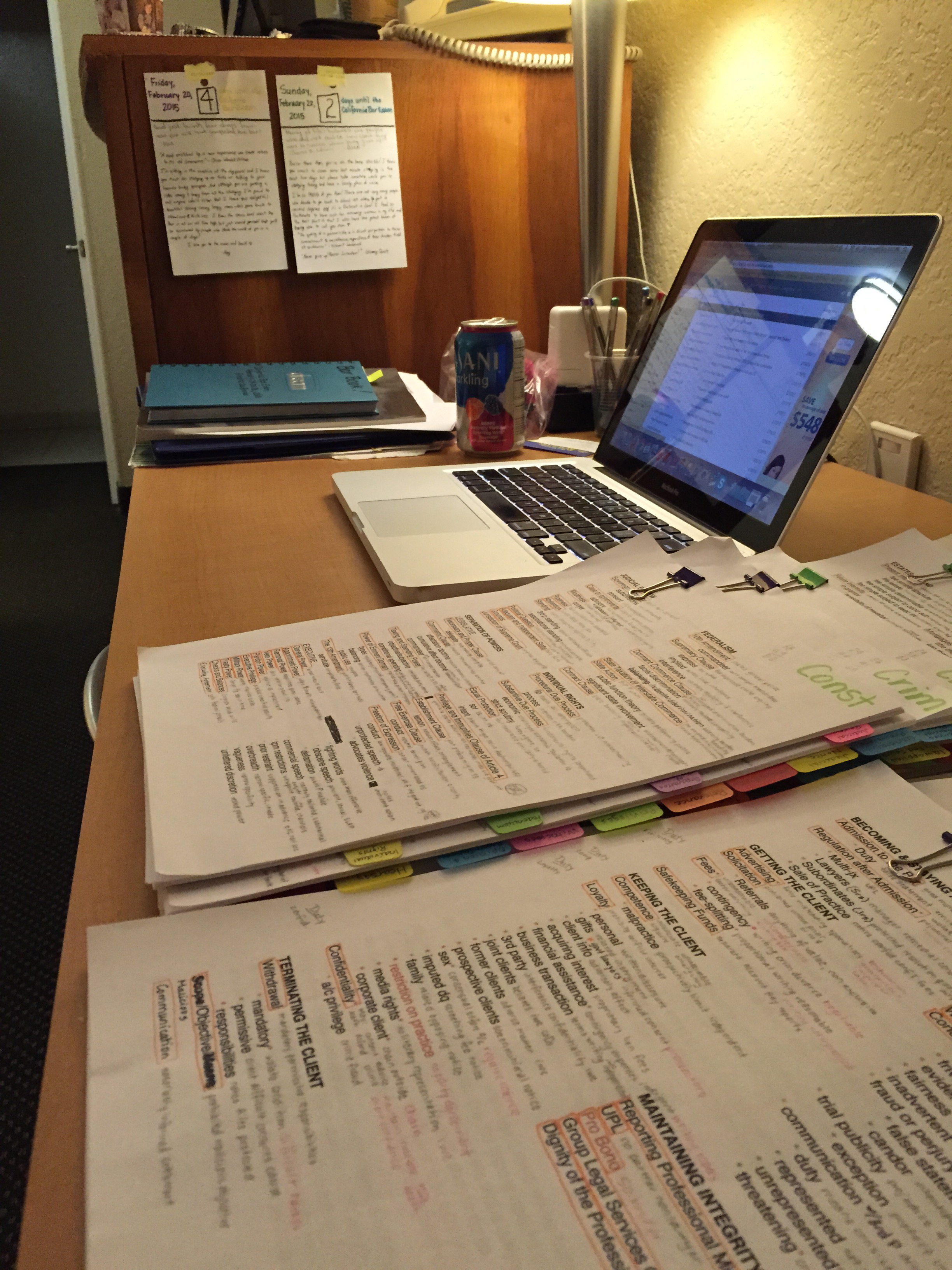 My study group was a fabulous bunch of brilliant women from law school. In particular my study buddy (and class co-valedictorian), Liz, was patient and tolerant as we messaged and skyped and emailed questions back and forth. Our freakouts parallelled, and having someone who understood where you were, what you felt, and the emotions you were going through was one of the most valuable things I took away from Bar Review.